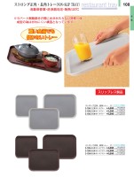 重い食器でも重い食器でも傾かないトレー傾かないトレー※ ラバート樹脂部分の間に水分が入らない特殊一体※ ラバート樹脂部分の間に水分が入らない特殊一体 成型の為はがれにくい構造となっています 成型の為はがれにくい構造となっていますスリップレス製品ノンスリップ加工ストロング正角・長角トレー J3-108-1 正角13インチグレー ¥4,000330×330×252-120-1(16012300)3-108-2 長角16インチグレー ¥5,200417×303×192-120-2(16012260)3-108-3 長角18インチグレー ¥6,000457×356×232-120-3(16012270)ノンスリップ加工ストロング正角・長角トレー J3-108-4 正角13インチブラウン ¥4,000330×330×252-120-4(16012310)3-108-5 長角16インチブラウン ¥5,200417×303×192-120-5(16012280)3-108-6 長角18インチブラウン ¥6,000457×356×232-120-6(16012290)108108お 盆ストロング正角・長角トレー(NON-SLIP TRAY)レストラントレー消毒保管庫・洗浄器対応・耐熱120℃