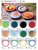 3-671-1 ¥500パステルグリーン パール塗 B 2-889-1(12041750)3-671-5 ¥550あんず パール塗 B 2-889-5(12041800)3-671-6 ¥550青磁 パール塗 B 2-889-6(12041810)3-671-8 ¥650金 パール塗 B 2-889-8(12041820)3-671-4 ¥500朱 パール塗 B 2-889-4(12041760)3-671-3 ¥500黒 パール塗 B 2-889-3(12041770)3-671-2 ¥500ブルー パール塗 B 2-889-2(12041780)3-671-7 ¥550グリーン パール塗 B 2-889-7(12041790)3-671-12 ¥650パープル 帯塗 B 2-889-12(50252531)3-671-11 ¥650イエロー 帯塗 B 2-889-11(50252521)3-671-10 ¥650グリーン 帯塗 B 2-889-10(50252511)3-671-9 ¥650ピンク 帯塗 B 2-889-9(50252501)671回転寿司皿 15㎝〈耐熱ABS〉 パール塗・帯塗回転寿皿ABSφ150